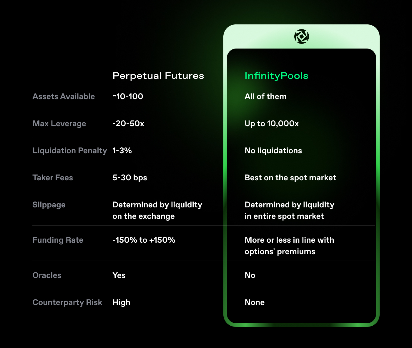 This risk usually occurs in crypto because of inefficient liquidations, oracle manipulation or because exchanges (like FTX) misappropriate assets. InfinityPools doesn’t have liquidations (positions are mathematically predetermined to settle correctly), is oracle-less and non custodial.